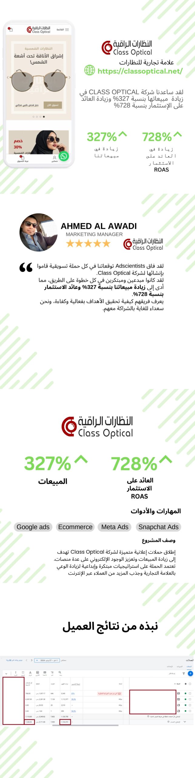 لقد فاقت Adscientists توقعاتنا في كل حملة تسويقية قاموا بإنشائها لشركة Optical Class. لقد كانوا مبدعين ومبتكرين في كل خطوة على الطريق، مما أدى إلى زيادة مبيعاتنا بنسبة %327 وعائد الإستثمار بنسبة .%728 يعرف فريقهم كيفية تحقيق الأهداف بفعالية وكفاءة، ونحن سعداء للغاية بالشراكة معهم